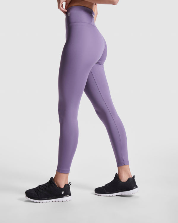 Leggings sportivi alla caviglia con ampia fascia in vita. Tasca posteriore sulla cintura con striscia riflettente. Incrocio interno sul girovita. Cuciture overlock tono su tono sulla vita.